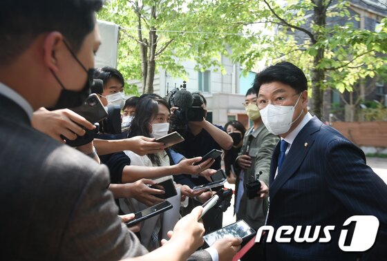 | 장제원 대통령 당선인 비서실장이 26일 서울 종로구 통의동 인수위 사무실 앞에서 취재진의 질문에 답하고 있다. 2022.4.26/뉴스1 © News1 인수위사진기자단 |