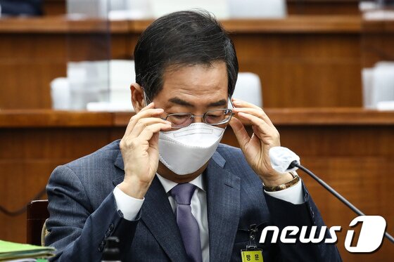 | 한덕수 국무총리 후보자가 2일 서울 여의도 국회에서 열린 인사청문회에 출석, 안경을 고쳐 쓰고 있다. (공동취재) 2022.5.2/뉴스1 © News1 유승관 기자 |