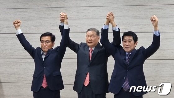 | 16일 오전 김진균 충북교육감 후보(오른쪽)가 사퇴를 선언한 뒤 중도보수 성향 단일 후보가 된 윤건영 후보(왼쪽), 이기용 전 교육감 등과 손을 들어 인사하고 있다.© 뉴스1 |