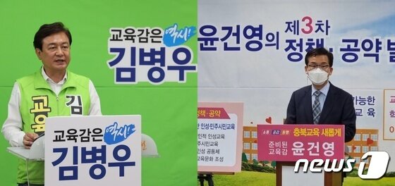 | 18대 충북교육감 선거에 출마한 진보 성향의 김병우 후보와 보수 성향의 윤건영 후보.© 뉴스1 |