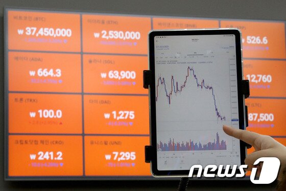 | 한국산 코인 '루나'와 자매코인 '테라USD(UST)'의 폭락 사태를 계기로 글로벌 금융업계의 암호화폐에 대한 비판이 거세지고 있는 24일 서울 서초구 빗썸 고객지원센터 전광판에 비트코인 등 주요 암호화폐 시세가 나타나고 있다. 국제통화기금(IMF) 총재는 세계경제포럼(WEF) 연차총회(다보스 포럼)에서 테라·루나 폭락 사태에 대해 “다단계 피라미드 사기”라고 비판했다. 2022.5.24/뉴스1 © News1 이광호 기자 |