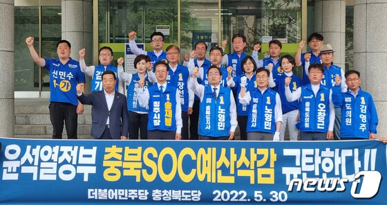 | 더불어민주당 충북도당 소속 6.1 지방선거 후보들이 30일 충북도의회 앞에서 기자회견을 열고 충북의 SOC와 농민 예산을 대폭 삭감한 윤석열 정부를 비판하고 있다. 2022.5.30/© 뉴스1 |