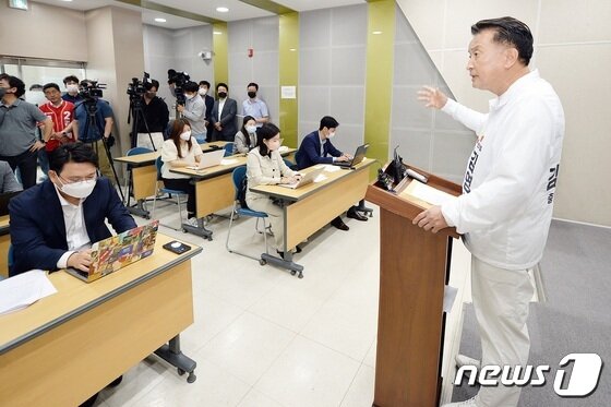 | 김영환 국민의힘 충북지사 후보가 30일 충북도청에서 기자회견을 하고 있다.2022.5.30/© 뉴스1 |