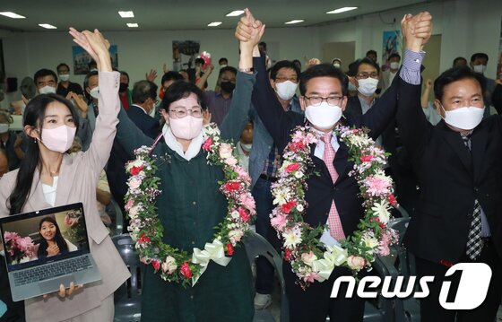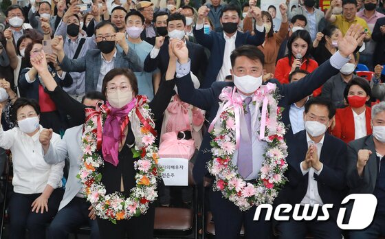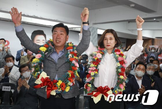 | 김영환 국민의힘 충북지사 후보 내외가 1일 충북 청주시 후원회 사무소에서 당선이 확실해지자 꽃목걸이를 걸고 환호하고 있다. 2022.6.1/뉴스1 © News1 김용빈 기자 |