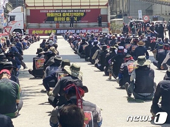 7일 화물연대는 단양군 매포읍 한일시멘트 공장 입구에서 집회를 갖고 올해 말 폐지 예정인 안전운임제 확대 시행 등의 대책을 요구하는 총파업 출정식을 가졌다.