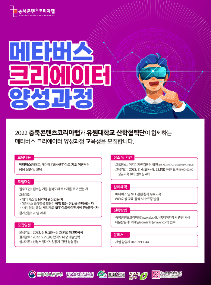모집인원은 20명으로 충북 도내에 주소를 두고 메타버스 및 NFT에 관심 있는 누구나 신청할 수 있다. 수강료는 무료다.