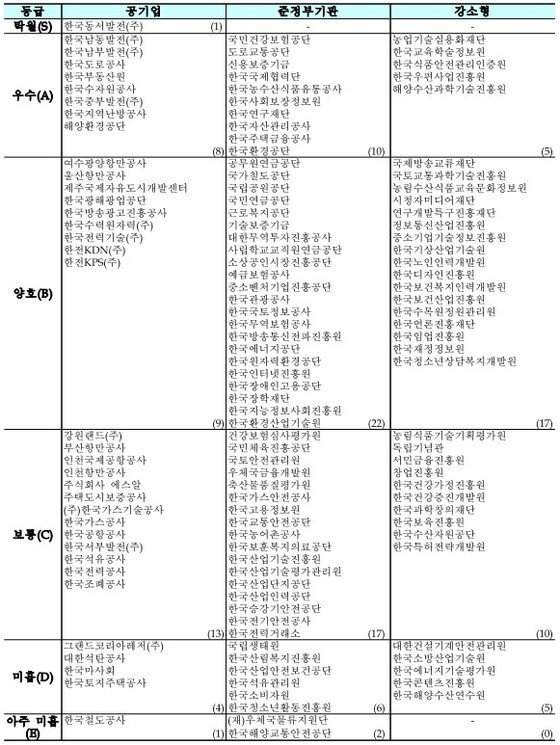 130개 공기업·준정부기관 평가 결과 성과급 미지급 대상인 미흡(D) 등급은 15개, 아주미흡(E)은 3개로 전년대비 각각 2곳 줄고 1곳 늘었다. 탁월(S)은 1곳, 우수(A)는 23곳, 양호(B)는 48곳, 보통(C)은 40곳이다.