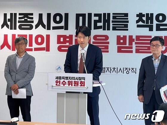 | 24일 세종시장직 인수위 류제화 대변인(가운데)이 24일 교통문제대책TF 분야 언론 브리핑을 하고 있다. (인수위 제공) © 뉴스1 |