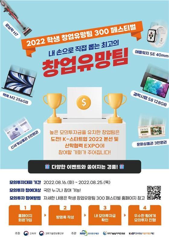 교육부와 과학기술정보통신부는 한국연구재단, 과학기술일자리진흥원, 한국청년기업가정신재단과 함께 '2022 학생 창업유망팀 300 페스티벌'을 개최한다고 15일 밝혔다.